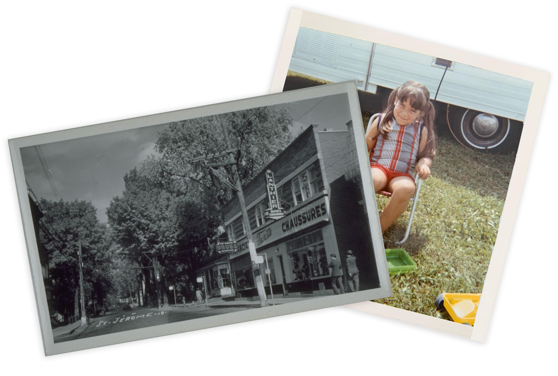 J’ai 5 ans. St-Jérôme, Québec. Nous habitons un triplex à côté de la voie ferrée, rue Bruno-Nantel. Assise au 2ème étage, dans l’escalier, je scrute attentivement mon quartier. J’ai un plan pour chaque maison : lui, je lui peinture sa brique en rouge; l’autre, j’installe de longs rideaux fleuris qui se balancent au vent. Dans notre cour, la propriétaire a installé un petit moulin à vent. Je suis fascinée par ça. Je me fais prendre en photo à côté, avec ma robe de tennis (ma pref)!